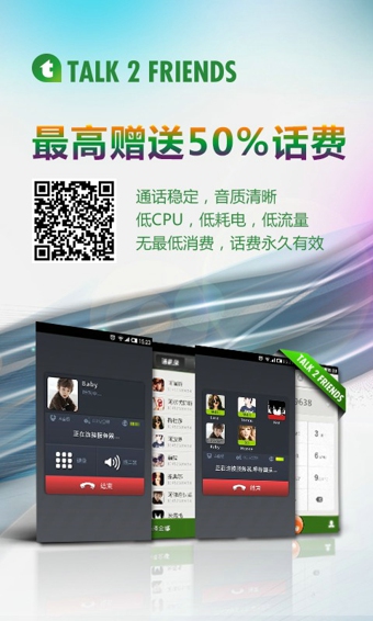 T2F(话友)网络电话---全球网络电话新贵,直拨呼叫,以便捷的操作,清晰的话质,为全球近30个国家地区的个人及企业提供优质服务。 进入中国市场后成功与腾讯,360,百度等国内巨头紧密合作。目前已成为百度搜索通话业务唯一合作伙伴。【软件特点】