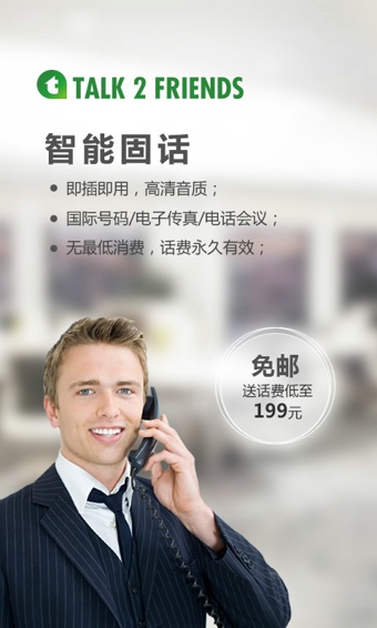 长期与国外亲人联系的家庭用户亦可选择智能固话,再也不用心疼电话费了。无最低消费,免费配备专用话机,随用随打。