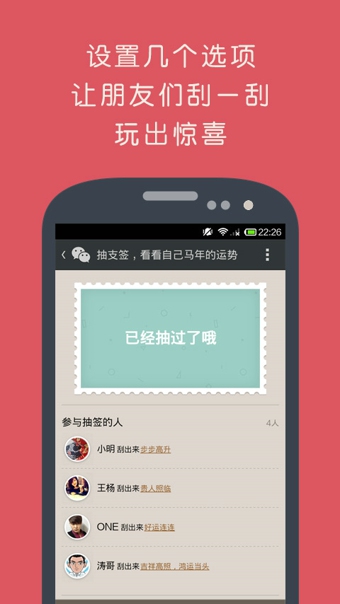 设置几个选项,让朋友刮一刮,刮完了抽签结束。