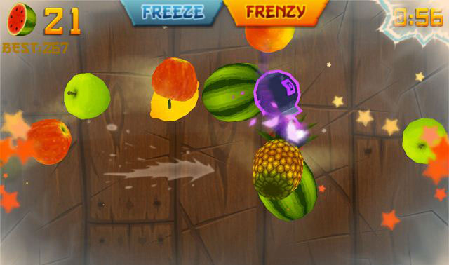 红黄相间的香蕉——狂热效果(Frenzy),短时间内在屏幕左右两侧飞出大量的水果,从两侧飞出的水果中不会夹杂炸弹