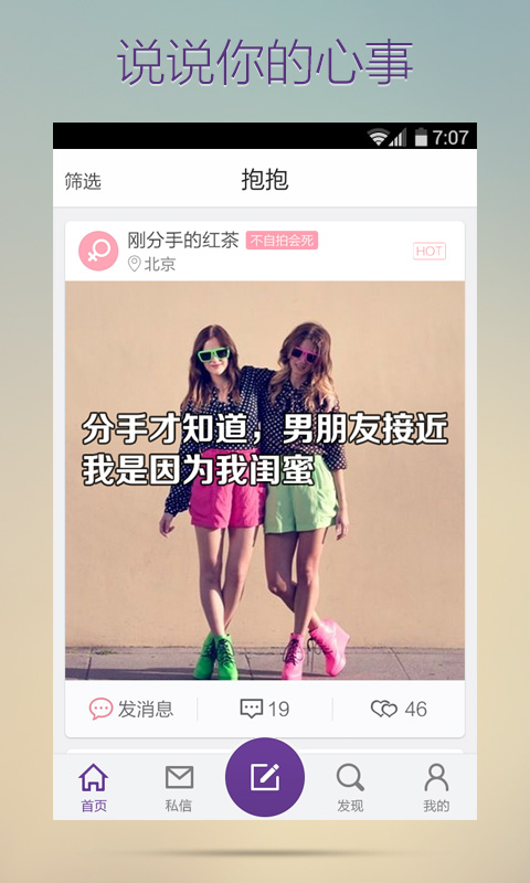 萌妹子、女神、高冷女王、自拍控......在抱抱里,每分每秒都有人愿意和你交流聊天,你的每一条消息,每一句回复,都有人立即和你互动,你会觉得自己不再是一个人。