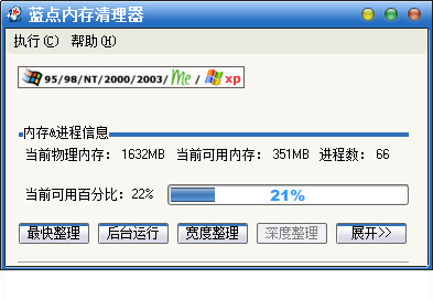 蓝点内存清理器 1.20 绿色版 蓝点内存清理器是一款电脑内存清理的软件,它几乎不占cpu,能更有效的帮助您整理电脑内存,优化电脑内存使用率,提高你电脑的运行速度。蓝点内存清理器可在后台运行的时候自动的清理内存,目前支持快速整理,深度整理,隐藏整理3个小功能,无需过高的电脑操作要求轻松一键式管理,是目前使用率最高的电脑内存清理软件。