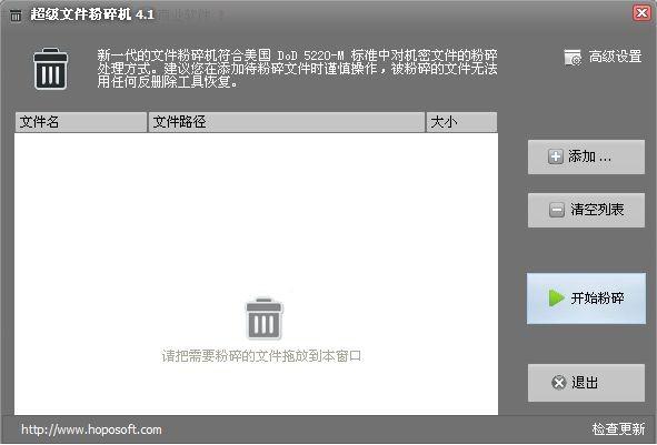 超级文件粉碎机 V4.1 最新免费版下载 超级文件粉碎机是小巧高效的文件粉碎工具。彻底粉碎文件,强制删除顽固文件。 当用户删除文件时,其实操作系统并未将该文件从存储介质上真正删除,而仅仅是在文件分配表中将该文件的相关信息删除,并将该文件的存储空间标记为可写。所以被删除的文件通常可以用一些文件恢复工具进行恢复。