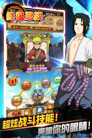 4,安装包小,流量少。在保证游戏精美度的情况下,《终极忍战》的安装包很小,且游戏中的网络流量也非常少;智能增量升级,游戏每次升级都只需要下载新增部分,一般只会有几十K,最大限度的节省宝贵流量。