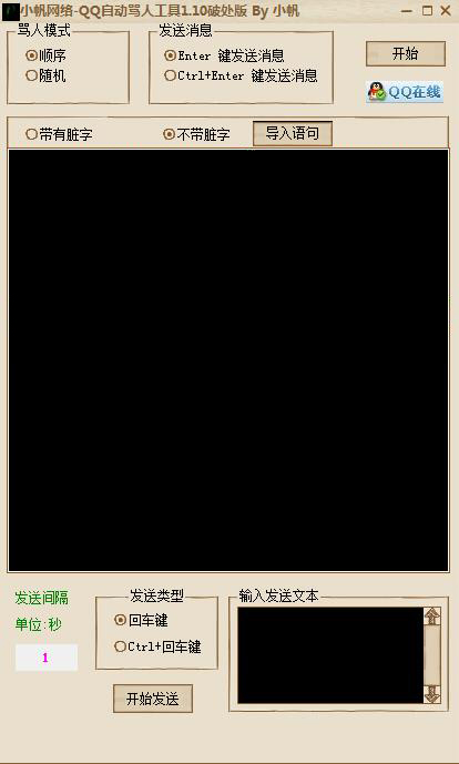 小帆QQ骂人工具是一款小巧好用的QQ自动骂人工具,该工具支持带脏字和不带脏字两种模式,用户只需导入软件自带的骂人语句,即可自动实现对话框骂人的功能。本款QQ自动骂人工具不仅适用于QQ聊天窗口,还可以在YY、阿里旺旺等聊天窗口刷屏骂人,一旦开启就能输出骂人语句,顿时刷满对方的聊天窗口,将对方打个措手不及。