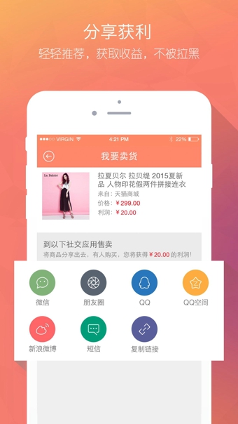将店铺或宝贝一键分享至微信,空间等社交平台,瞬间曝光,交易获利。