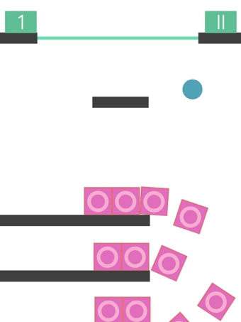<Bounce>的主角是一颗蓝色的球,想必游戏类型一定就是常见的休闲游戏了,玩家需要通过操作将让球顺利通过一条绿色的线,通过一条线则加一分,而周围也有黑色的平台供小球停留调整,不过玩家要小心别让小球掉出画面外,如果掉落出去则游戏结束,此时并结算玩家的分数。游戏的操作方面,玩家只需要点击屏幕的左右两边即可控制小球往左右两个方向移动,游戏开始之后小球就会自动进行跳动,玩家只需要控制小球移动的方向即可。