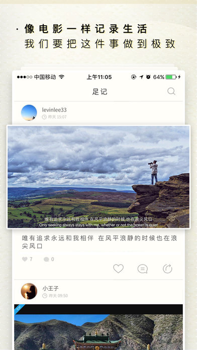 除了去“发现”,我们也可以主动留下自己的足迹,只要是自己认为有意义有情调的地方都可以拍个照,立下只言片语打上字幕来述说当下的心情,添加上滤镜之后看着也有那么点大片既视感。接着我们可以分享到朋友圈、微博、QQ 等社交平台,与好友们一同感受心中的喜悦。这个“足迹”发布到展示板之后其他的陌生小伙伴也能看到,看到这里,小编已经找不到任何理由说不知道去哪儿旅游了,话说回来,不少旅游 APP 里也有这样的足迹分享功能。