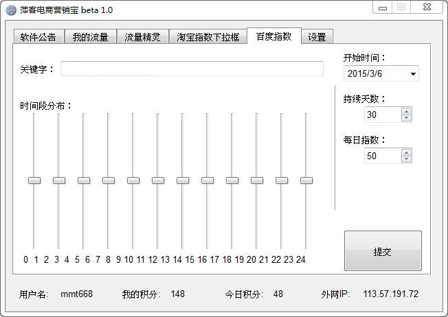 界面分六个模块,分别是【软件公告】【我的流量】【流量精灵】【淘宝指数下拉框】【百度指数】【设置】。