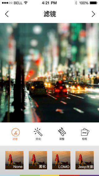 APP内置数十余款超赞滤镜及Jeep定制水印来强化您的手机摄像效果,瞬间提升照片质感。