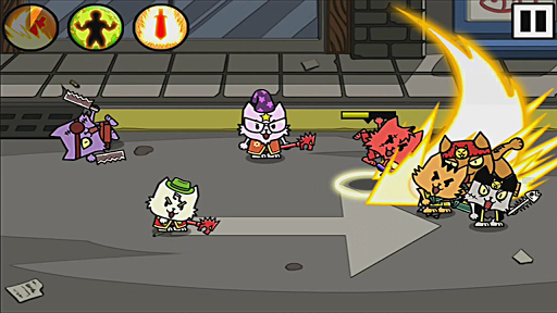 从现在开始这个巷口由我们来接管!!!后街历史上最伟大的战斗开始了.但是与12位英雄一起的话就没有什么可怕的了。现在请来确认我们英雄们的精彩活动吧!本作是一款横版闯关游戏,玩法上传承《战斗之心》的点击与划线操作,RPG 和即时战略要素也一个不少,再配合戳到萌点的喵星人和职业技能系统,让游戏充满了一派欢乐的色彩。卡通的画风和Q版的角色造型,以及各种炫目的技能光影效果的结合,使得游戏展现出别样的战斗乐趣。而怪物的造型和各种攻击和技能释放,也有独特之处,让游戏整体的战斗表现力显得更加出色。游戏中一共有12位能力迥然不同的英雄让玩家使用,但每次出战只能带上其中4位,战斗方式和操作玩过类似划线游戏的都可以轻松上手。每名英雄在攻击方式、属性上都有不同定位,如何合理搭配是顺利过关的关键。