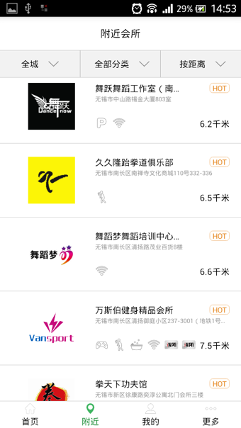 “附近”功能,寻找距离最近的运动场馆辐射用户所在地全城的会所,可根据距选择离进行筛选,为健身而出行,就是要方便快捷!