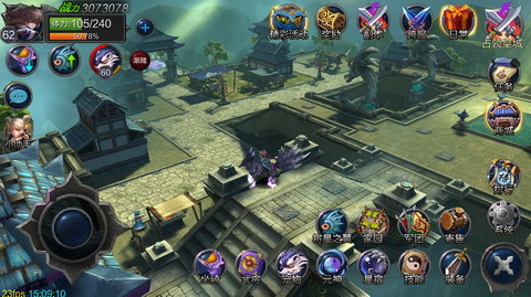 游戏采用无锁定的战斗模式,屏幕中左键为虚拟摇杆控制玩家移动,右键为技能键点击释放技能。技能释放消耗蓝,等待CD,战斗中可以补血,也可以复活。