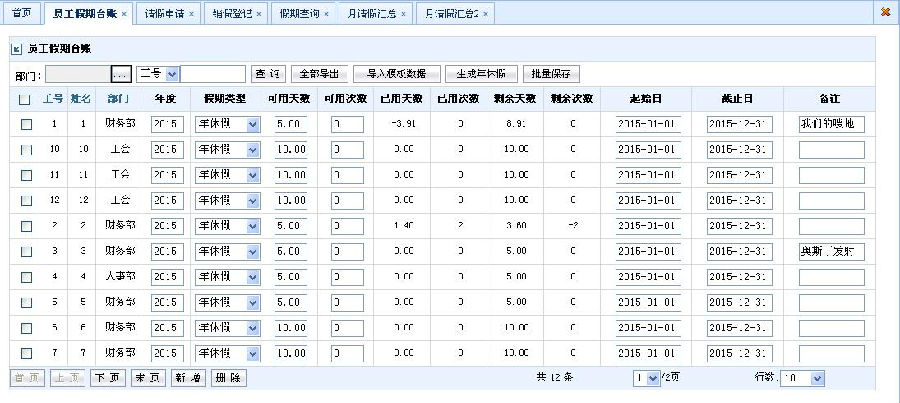 6、建立员工假期台账记录,通过台账对假期申请天数和次数进行控制,员工年休假按照工龄自动计算。