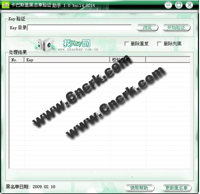 卡巴斯基KEY黑名单验证助手是一款可以批量验证、查看卡巴Key是否重复/列入黑名单的软件。无插件,绿色。支持拖曳单个/多个Key文件到界面,直接显示Key信息(是否重复、是否有效等等)