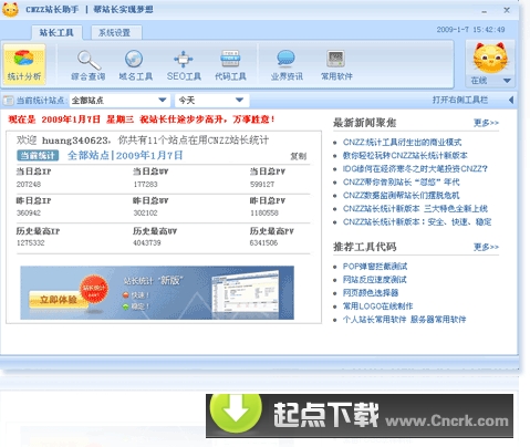 CNZZ站长助手 V2.0.0.679 简体中文绿色免费版 CNZZ站长助手具有IM沟通、站点统计数据实时推送等功能,以悬浮窗的方式在电脑桌面呈现站点核心数据即时变化状况,让站长一目了然的知悉自身网站流量变化情况,除此之外,CNZZ站长助手还为站长集成提供多种实用的站长工具软件,如SEO工具、域名工具、站长常用代码等,可以说CNZZ站长助手已经成为站长装机必备的一款绿色软件