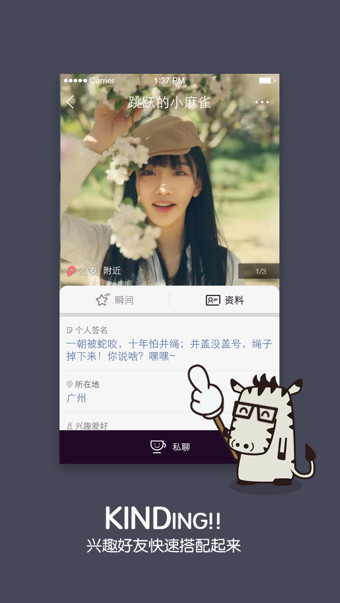 KIND是一款LBS(基于位置的服务)的陌生人限时聊天交友移动软件。在KIND中一张图+一句话即可创建一个聊天室,分享任何你感兴趣的话题。当然也可以加入附近已被创建的聊天室,捕获同类。当你发现自己的同好,兴趣无人分享时,发布或加入“秒聚”聊天室,共同兴趣,喜逢知己。