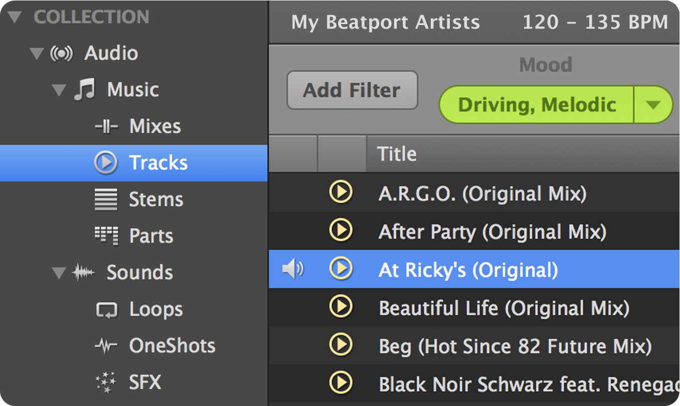 管理你的音乐收藏:导入和组织您的音乐收藏。创建和管理播放列表。添加扩展元数据到你的整个集合,并利用先进的过滤功能,以全新的方式查看您的音乐收藏。由轨道,混合,茎,零部件,循环,oneshots,和声音效果整理您的音频。