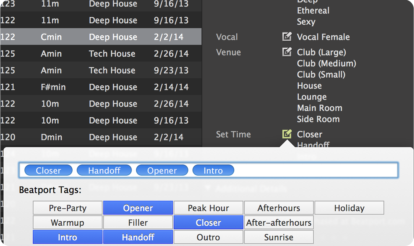 与属性,如“场地”,“意境”,“仪器”,并标记您的音乐收藏“处理”。没有更多的黑客入侵您的意见或流派标签。同步您的整个音乐收藏与广泛Beatport目录,以确保您的元数据是完整的。改变你的音乐收藏中,你从来没有想过可能的方式。