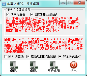 ALT+A:特别切换模式,切换后可以将音量设置为静音!如果不启用【固定切换至桌面2】的话将会在桌面一和桌面二之间进行切换,如果当前桌面为原桌面或桌面一的时候将切换到桌面二。如果是桌面二的话将切换为桌面一。在【切换后静音】启用的情况下,在切换完桌面后会静音(仅在特别切换模式下才可静音!)。