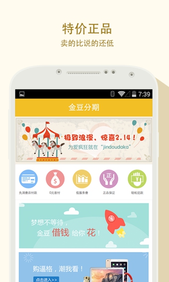 金豆分期总部位于北京市海淀区,是国内首家大学生一站式信用服务平台,主要为大学生、研究生提供3-24个月的商品、教育、旅游等分期服务。公司秉承“低价、便捷、极速、正品”的产品理念对“金豆分期平台”进行不断改进、升级,使之成为大学生最可靠、最贴心的小伙伴儿!0首付,100%正品,全网秒杀,灵活分期,轻松还款,累积诚信;更有1000元至3000元的“借钱花”让你随心所欲,想做什么就做什么!【软件特色】