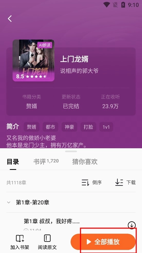2、寻觅到自己想听的小说,点击进入。接着点击“全部播放”,就能免费畅快收听整本小说。