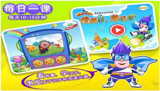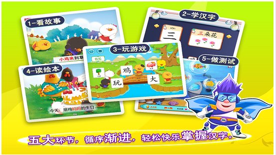 4、四大学习环节(看故事,学汉字,玩游戏,看绘本)循序渐进。(iOS版共5大环节,多了“做测试”)
