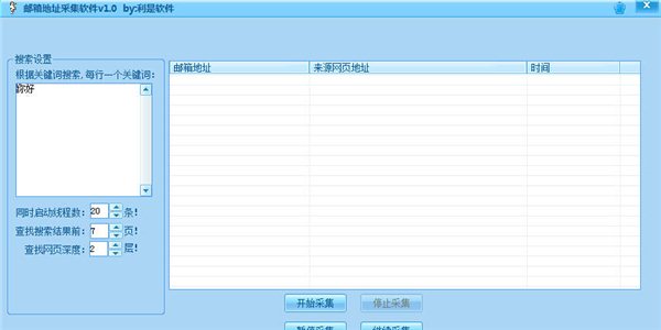 1、搜索设置框里输入关键词,可以输入多个关键词,每行一个关键词。2、设置启动线程数和输出设置3、点击开始采集