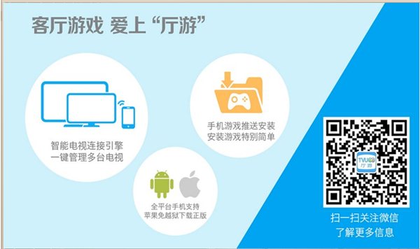 厅游助手是一款能够让智能电视与手机连接,通过手机来操控智能电视进行游戏的多屏互动工具。 可让您的电视瞬间变成一台专业的智能电视游戏机,简单让你就享受到躺在沙发上,大屏幕玩游戏带来的无比快感。 让你体验在智能电视上玩滑雪大冒险、天天飞车、天天酷跑、疯狂喷气机、极限赛车等时下热门安卓游戏。【安装方法】