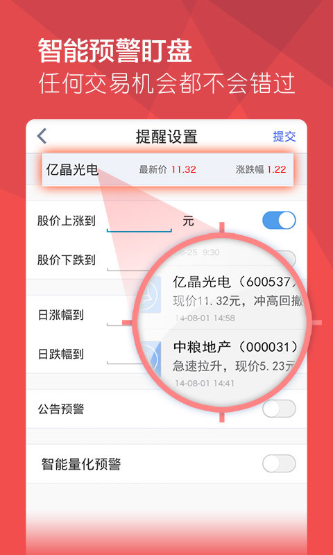 1、免费交易机会,轻松快捷抓牛股;2、云端智能盯盘,实时提醒个股异动;