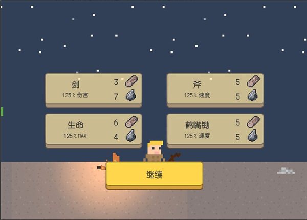 另外,我们需要收集足够多的材料来进行升级,除了已经升了一级的伐木、采石等级,我们的武器和生命值也需要升级,并且建议重点升级武器,这样可以更好地应对生命值增多的怪物。