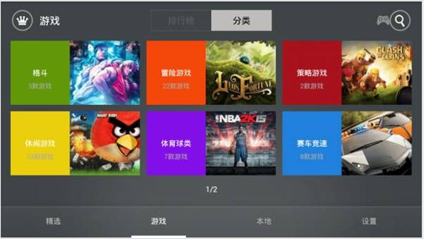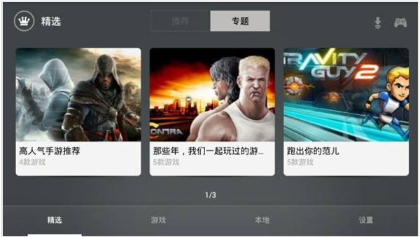 游戏中心默认横评显示,有精选、排行等几种游戏分类方式,有本地游戏和个人管理中心。盗猎车、世界2、疯狂出租车、卡丁车等经典游戏都在其官方适配列表里。
