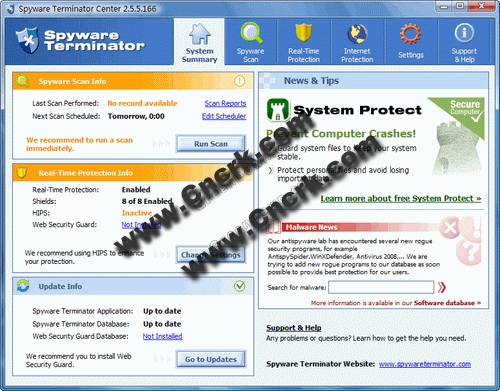 免费且易用的间谍软件清除软件,同时也能够实时保护你的系统不受木马、浏览器劫持及恶意软件等的入侵。与大多数优秀的间谍软件查杀工具一样,Spyware Terminator也拥有一套恶意代码特征库,这个库可以在线更新,使你能防范各种新型恶意程序的攻击。