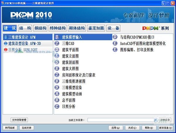 pkpm2010是目前pkpm系列软件中的最新版本,新版本在使用功能与操作上均有重大突破,能够自动选配钢筋,按全楼或层、跨剖面归并,布置图纸版面,人机交互干予等等。同时应广大客户的要求,隆重推出了PKPM接口软件P-Trans,实现了与ETABS、MIDAS、REVIT等软件的接口;另外,pkpm2010软件还与Bentley公司达成战略合作协议,共同合作为设计院量身定做打造了BIM协同设计平台PKPM-PW。