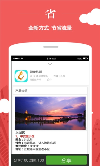 (3)全新方式 节省流量:操作简便,只需轻点分享按钮,不连wifi手机流量也够用。