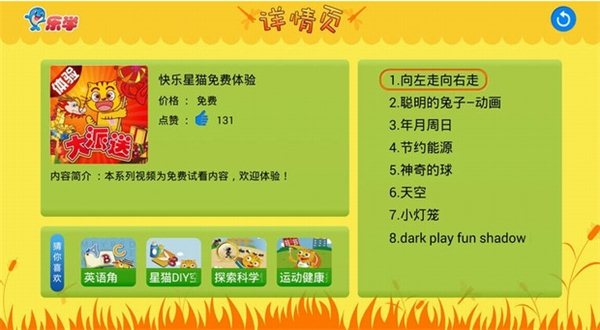星猫成长乐园根据幼儿的发育特征及规律,以动画、实拍等多种表现方式展现的幼儿节目。视频资源包括趣味动画、玩偶剧、实拍情景剧、小实验、小手工、音乐剧等多种多样的形式,内容涵盖基础学习、科普知识、社会生活、故事欣赏、手工制作、歌舞律动等单元,带领孩子跳出书本,拓展认知,加深理解,共同感受“世界无限大,世界很精彩”。【安装方法】