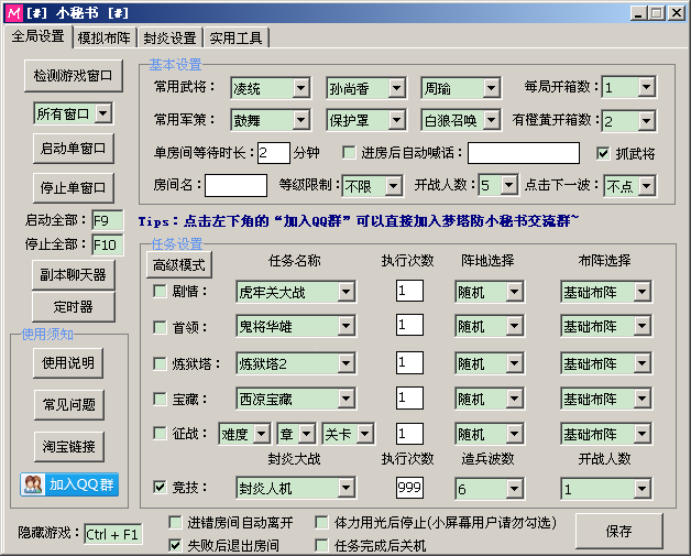 2.设置任务检测好窗口后,就可以对游戏窗口进行任务设置。可以选择“所有窗口”,对所有窗口进行设置,也可以单独选择某个游戏窗口进行设置,设置完成后点击保存,请不要选择自己没有的武将或军策。