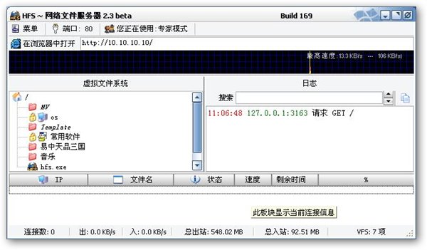 Http File Server是一款http文件服务器软件,您可以使用Http File Server进行发送和接收文件,运行速度快,操作简单,支持下载和上传、虚拟文件系统、HTML模版、带宽控制、简单模式与专家模式、LOG记录、完全可控连接、账户管理、动态域名更新等功能。