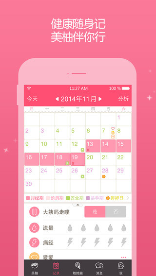 界面,简单直接,方便用户选择。“我要记经期”是最原始的大姨妈模式,能够提供经期相关的记、算、分析、预测、建议等服务。“我在备孕”提供备孕相关服务,“我怀孕了”提供孕期相关服务。四大模式的推出,美柚一方面可以增强工具功能,逐渐摆脱“经期工具”的标签;另一方面,美柚的大数据优势得以有效发挥:对用户底层数据进行精细分类,对用户本身进行精准定位,使之提供更有效更有针对性的解决方案。