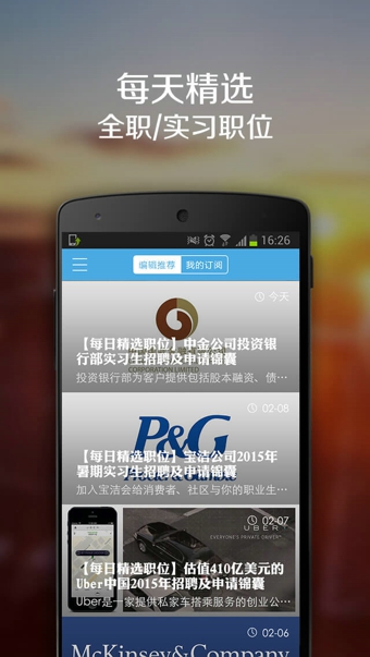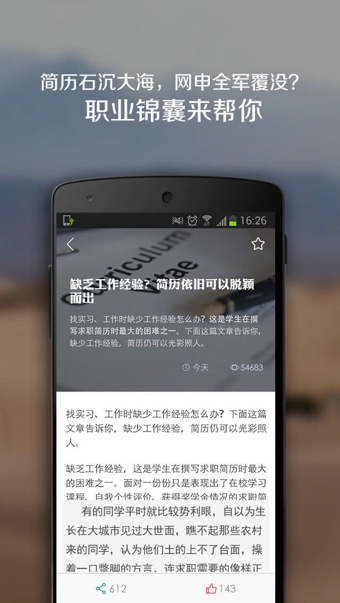 「职业笔记」是一个为大学生提供求职帮助的产品。不同于招聘类产品,「职业笔记」侧重于提供有价值的职场资讯,帮助大学生真正得到合适的工作机会,着眼长远的职业发展和不同的职业生活方式。