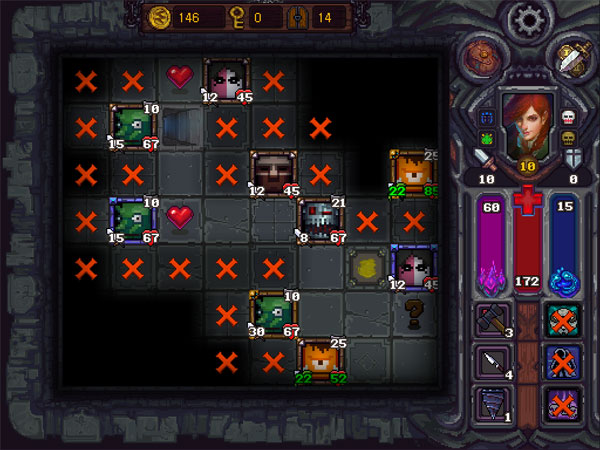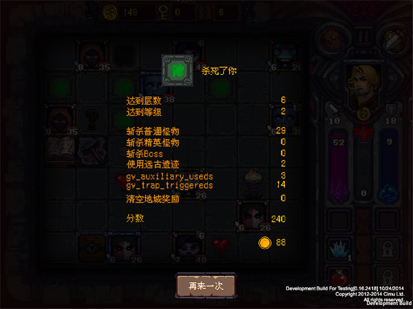 危险的陷阱,狡诈的怪物,诡谲的事件充斥在阴暗方格组成的地牢之中,步步惊心的探索,小心翼翼的搜集,孤注一掷的博弈,命悬一线的逆转和功亏一篑的败亡都是眨眼云烟,装备、魔法、还有强大的神祗,这些才是孤独英雄篝火旁的常客;游戏包含了永久死亡要素,每次重新开始游戏英雄面对的都是完全重新随机生成的地城内容和怪物组合,你不仅要尽可能深入的探索,还要面对诡异而且致命的怪物组合;玩家不仅要像传统游戏一样专注于构建自己的角色,还要能随机应变地运用地城里的各类元素应对出现的情况。你永远能从上一次的死亡中学到新的解决之道。【游戏特点】