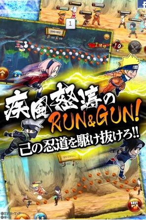 1、本作是以动漫《火影忍者》为题材改编的横向卷轴类忍者动作跑酷游戏,游戏中除了可以用跳跃来闪避敌人,并收集道具外,还能使用各种攻击和忍术,或是和小伙伴们一起组队来挑战难度关卡。2、游戏中的角色自然也不会让各位失望啦,除了《火影忍者》原作中的鸣人、佐助、卡卡西、我爱罗、小樱等,之后也会陆续推出《疾风传》中的一些人物(其实这些都不重要,我只要我爱罗~)。当然,游戏中也会和动漫一样,每个忍者都有自己专属忍术哦。