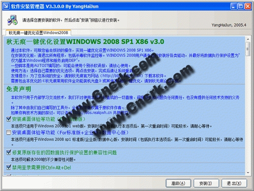 ◆支持一键将WINDOWS 2008和Windows 2003 SP2 X86快速设置成适合个人用户使用的系统。