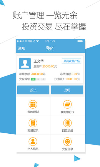 1、投资提醒:投资动态及时提醒,优质项目不再错过。2、提现:手机支持提现功能。