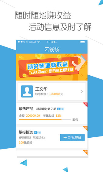 新用户体验云钱袋app即送豪礼,老用户邀请好友理财得收益分红。100元起投, 8~14.6%的年化收益率,第三方资金托管,100%本金保障,Norton安全技术保障用户资金安全。【特点】