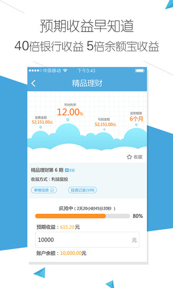 4、理财产品计算器:输入投资金额的同时动态计算预期收益,让您一目了然。