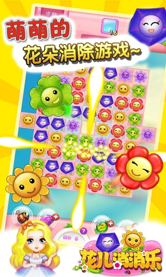 《花儿消消乐》这是一款可爱的花朵主题的消除游戏。游戏规则简单,需要三朵或三朵以上相同花朵连在一起才会消除,4个以上的相同花朵消除后会变成各种炸弹,消除炸弹或交换炸弹,会获得威力更大的消除效果。