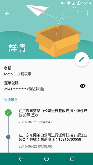 水表助手是一枚符合Material Design风格快递物流信息追踪应用,通过支持大部分主流物流公司的爱查快递API,快捷地获取最新状况。没有多余的功能,无需登录任何帐号,清新的应用界面也许能减轻你在等待中的一丝焦虑。【软件特点】