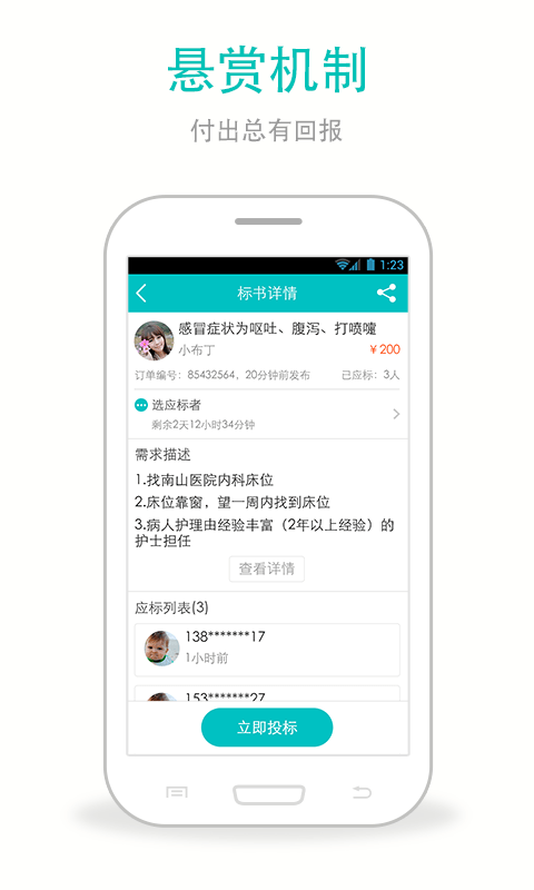 微诊堂"从供需原理出发、以自由市场为平台,由用户端发起以需求(如健康咨询、预约床位、门诊挂号、寻求名医等)为导向的悬赏交易,同时引入医护端(拥有医疗资源的群体)来为其提供解决方案。如有需要,请下载。