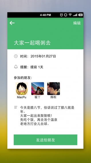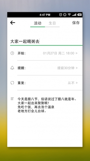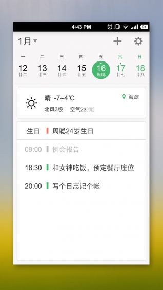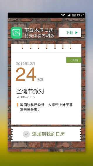 一款简单,有用,还能提升你社交逼格的日历 一目了然,日历她就应该这么简单 微信邀请,轻松跟小伙伴共享日程 灵活创建日程,生日,纪念日。日周月年,各种重复规则自由设置 可定制提醒,震动,铃声,提醒时间由你定,再怎么任性都满足你 万年历,农历,节日,节气,法定节假日,你想要的全都有 实时天气预报,刮风下雨早知道 品质生活,从木瓜日历开始!
